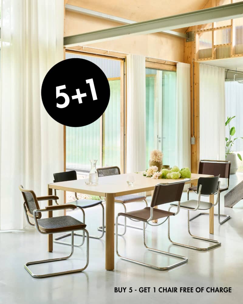 Deze innovaties zijn onlosmakelijk verbonden met Thonet. Ter gelegenheid daarvan bieden we een exclusieve actie: Bij aankoop van 6 Bauhaus sledestoelen (S32/S64, S33/S34 of S43/S43F) ontvang je de goedkoopste stoel gratis. Modellen en kleuren kunnen vrij worden gecombineerd.