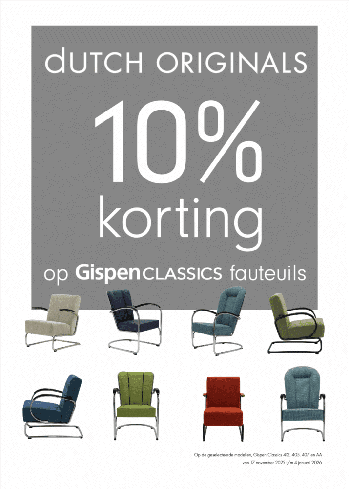 Tot en met 4 januari 2026 ontvang je 10% korting op een aantal van onze meest geliefde Gispen Classics fauteuils: de 412, 405, 407 en de AA. Stuk voor stuk tijdloze ontwerpen die niet alleen prachtig staan in elk interieur, maar ook garant staan voor jarenlang zitcomfort.