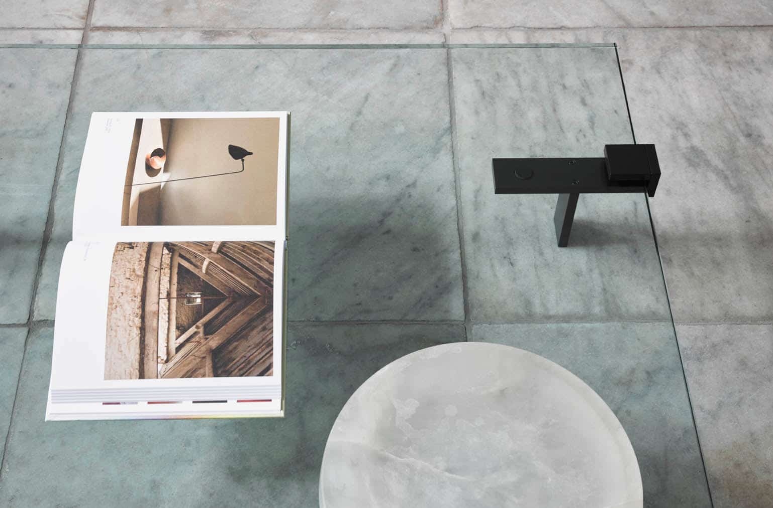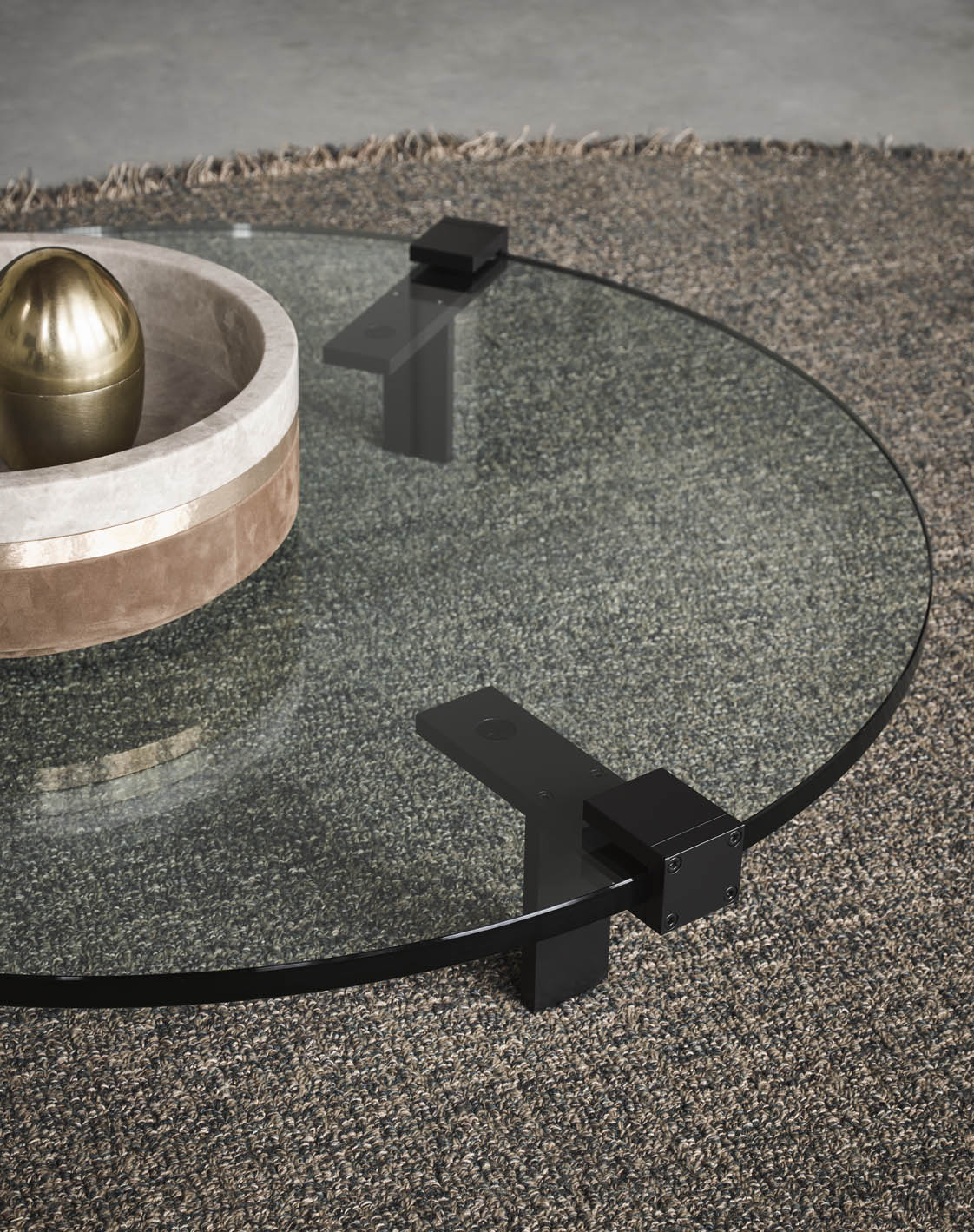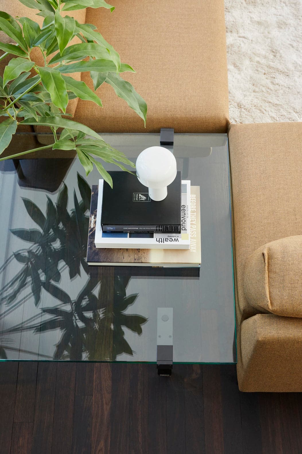 Een glazen tafelblad dat wordt gedragen door stoere T-elementen van gepoedercoat staal: dat is de T-Table van Bart Vos, ontworpen in 2018.