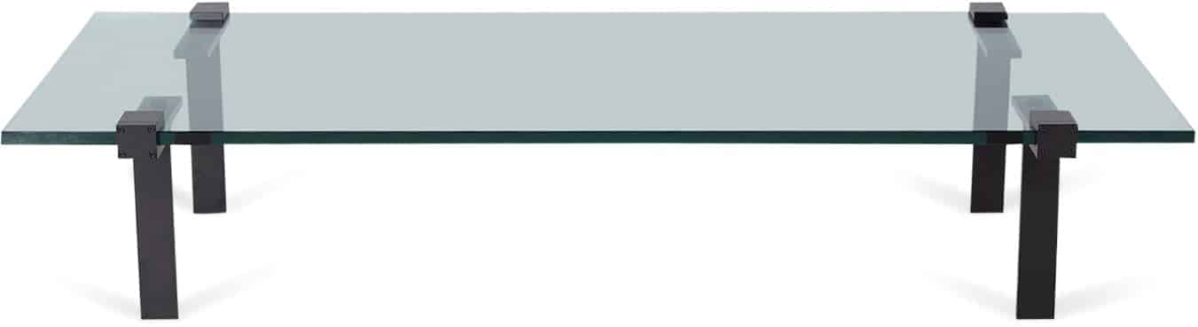 De T-Table van Bart Vos is verbluffend eenvoudig, maar is toch niet te missen. Stoere T-elementen van gepoedercoat staal dragen het glazen tafelblad. De drie of vier vrij te plaatsen poten kunnen een blad tot drie meter dragen.